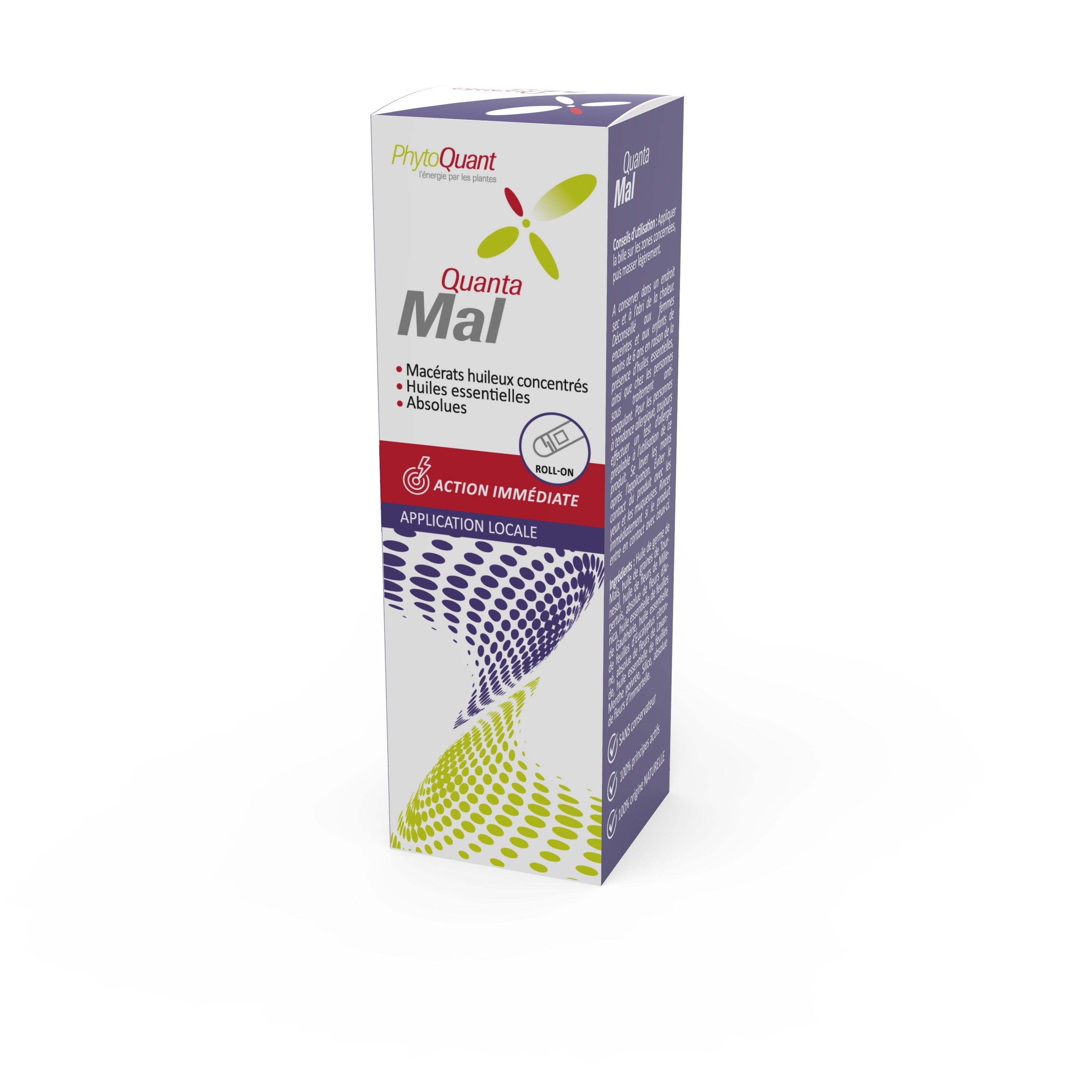 Présenté dans un tube de 50 ml muni d’un roll-on pour faciliter l’application et le massage, Quantamal est un heureux mélange d’huiles essentielles, d’absolues et de macérât huileux de 7 plantes anti-inflammatoires et antalgiques : arnica, eucalyptus citronné, millepertuis, lavande, gaulthérie, immortelle et menthe poivrée.