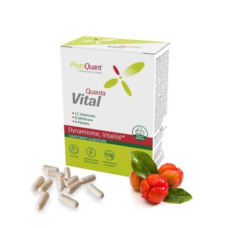 - QuantaVital stimule la vitalité et réduit la fatigue avec un cocktail de 11 vitamines, 6 minéraux et des plantes comme la spiruline et l’éleuthérocoque, tout en protégeant les cellules contre le stress oxydatif. En savoir +