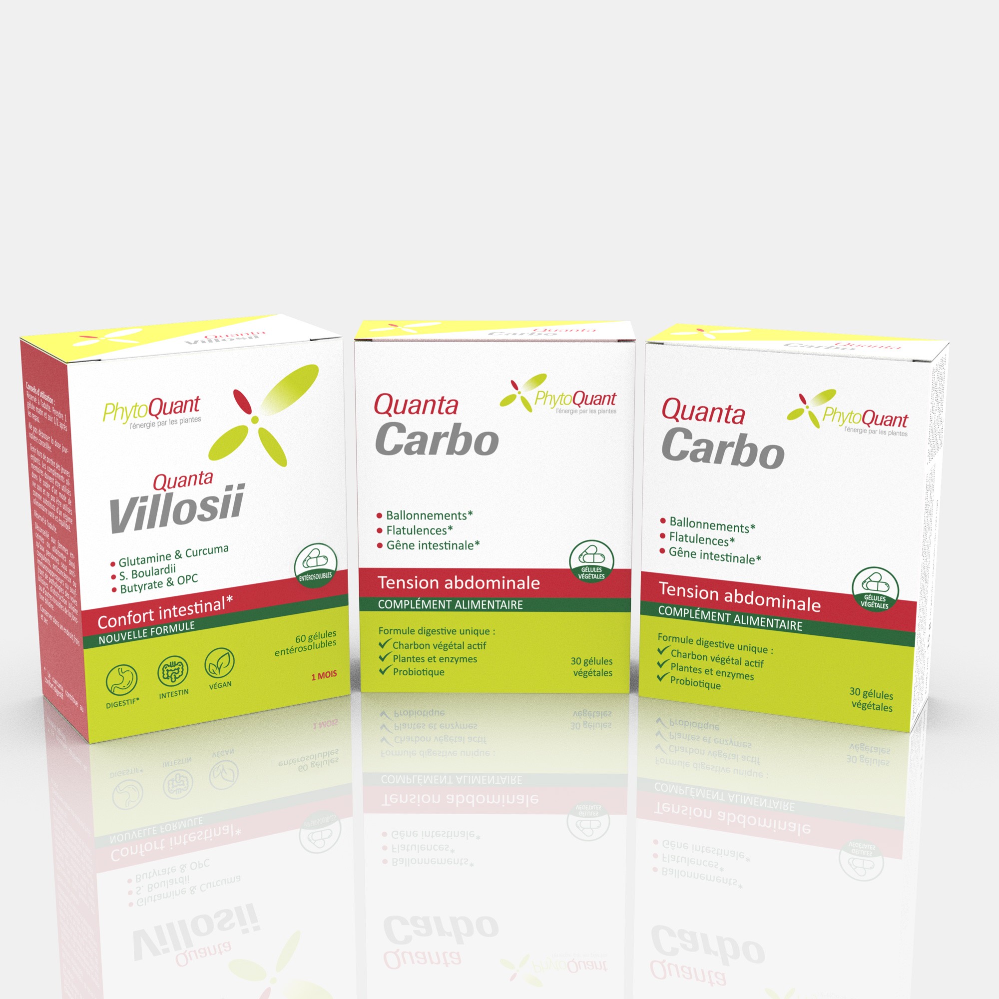 La Cure Ventre Plat associe deux innovations PhytoQuant : QuantaCarbo et QuantaVilloSII. Pour une efficacité immédiate, optimale et durable contre ces troubles digestifs.