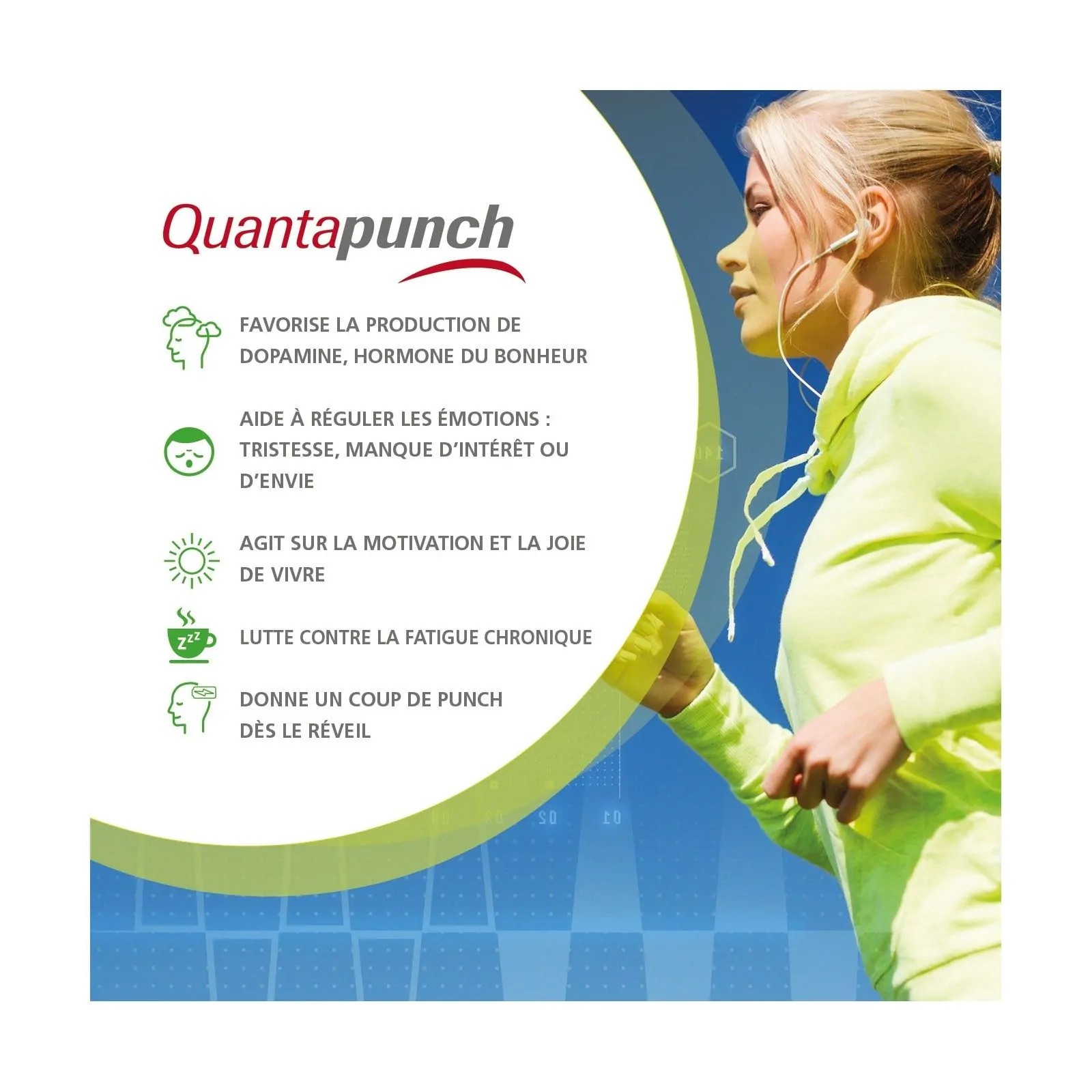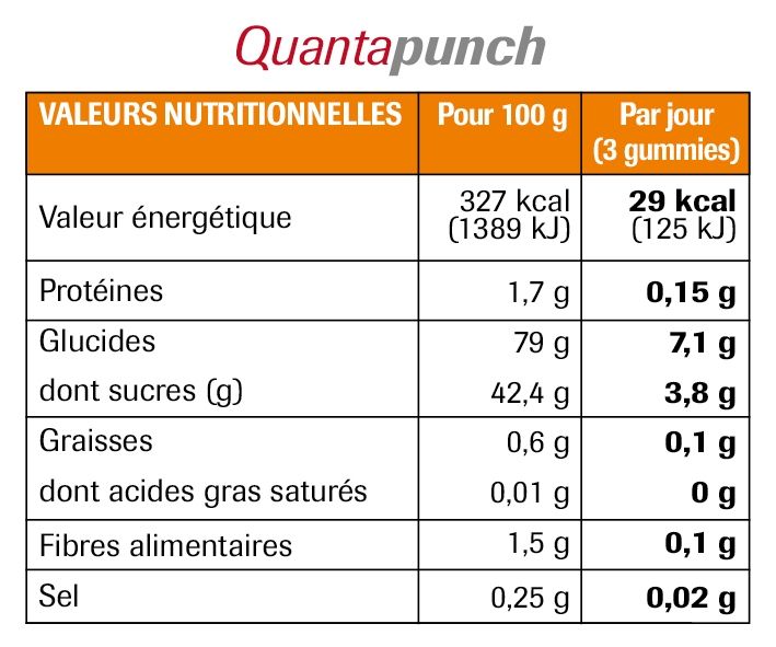 - QuantaPunch soutient les fonctions cognitives et les performances intellectuelles grâce à un apport en tyrosine, fer, zinc, et vitamines essentielles. Il aide également à réduire la fatigue et améliorer la mémoire grâce à des composants comme la Bacopa, utilisée traditionnellement en médecine indienne. En savoir +