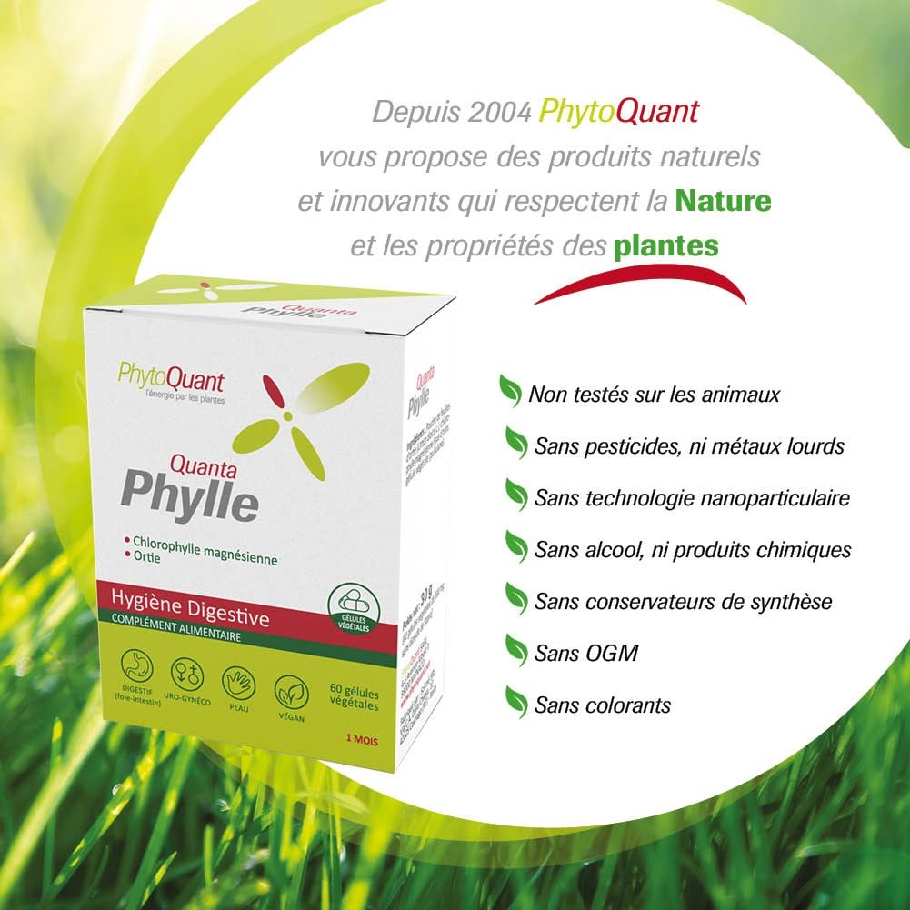 - QuantaPhylle étant un complément alimentaire respectant la réglementation en vigueur, nous disposons d’une traçabilité totale sur les ingrédients utilisés. Celle-ci nous interdit d'être explicite sur les bénéfices des compléments alimentaires.