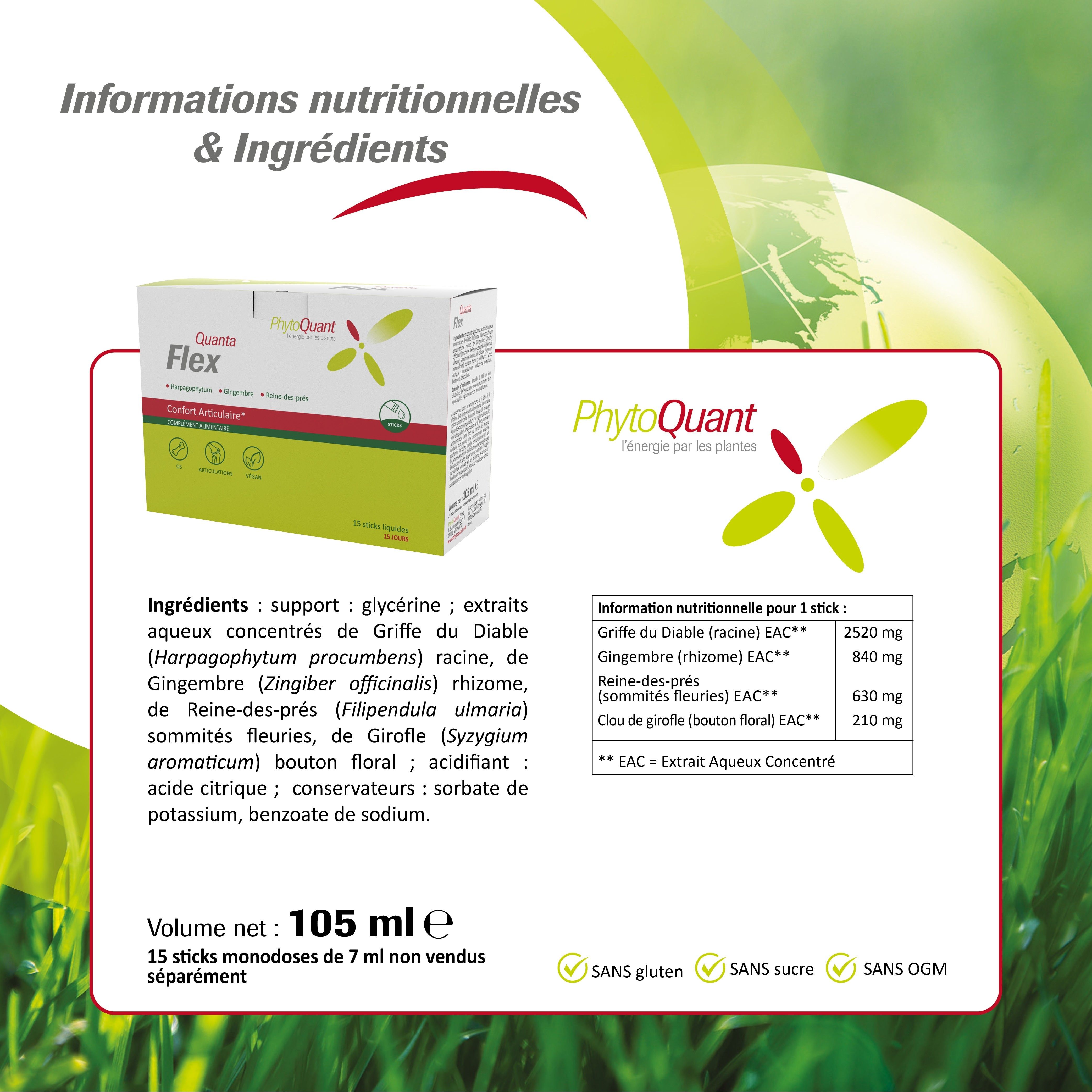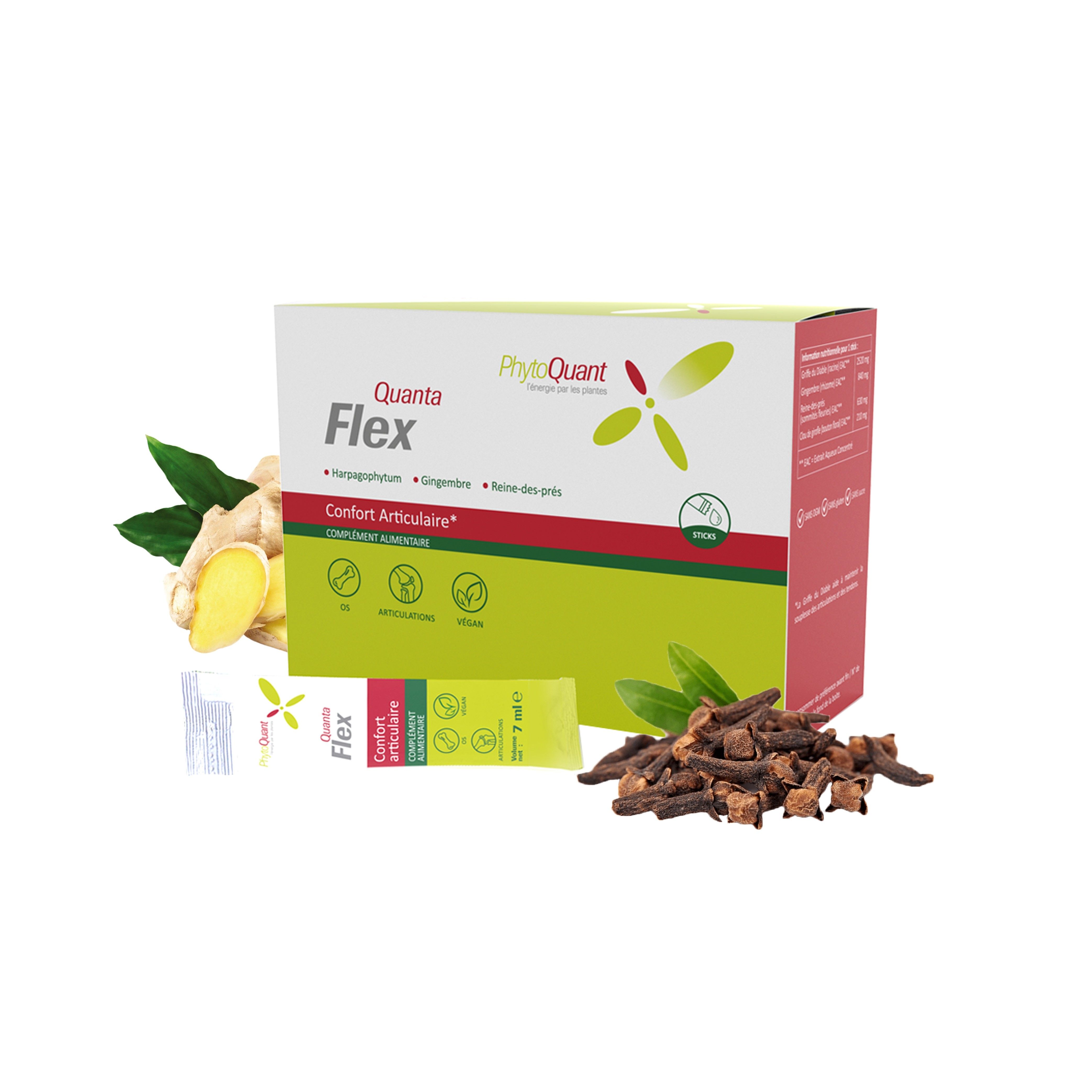 Conscient de cette nécessité et grâce à ses procédés d’extraction et de concentration, PhytoQuant propose Quantaflex : une association unique de plantes en unidose permettant d’apporter des quantités suffisantes de principes actifs. Ainsi, 1 stick monodose de Quantaflex de 8 grammes est si concentré qu’il apporte l’équivalent de 10 grammes d’harpagophytum, 3 grammes de gingembre et 2,5 grammes de reines des prés !
