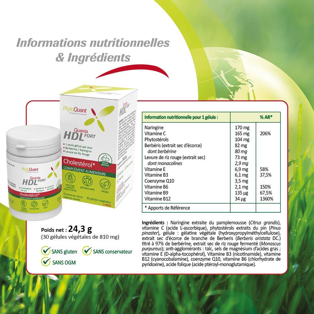Naringine extraite du pamplemousse (Citrus grandis), vitamine C (acide L-ascorbique), phytostérols extraits du pin (Pinus pinaster), gélule : gélatine végétale (hydroxypropylméthylcellulose), extrait sec d'écorce de branche de Berberis (Berberis aristata DC.) titré à 97% de berbérine, extrait sec de levure de riz rouge (Monascus purpureus) ; anti-agglomérants : talc, sels de magnésium d'acides gras ; vitamine E (D-alpha-tocophérol), Vitamine B3 (nicotinamide), vitamine B12 (cyanocobalamine), coenzyme Q10, vitamine B6 (chlorhydrate de pyridoxine), acide folique (acide ptéroyl-monoglutamique).