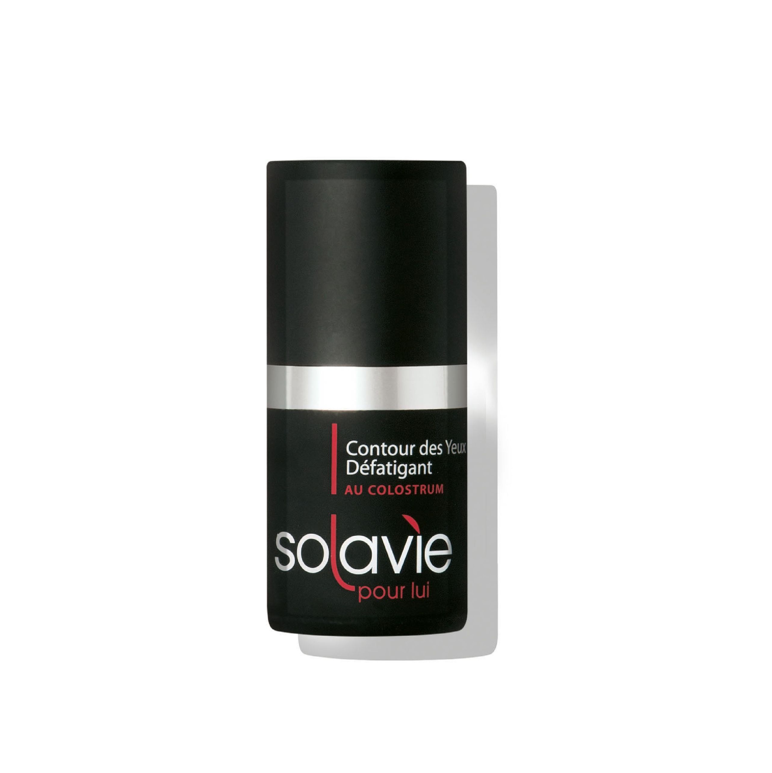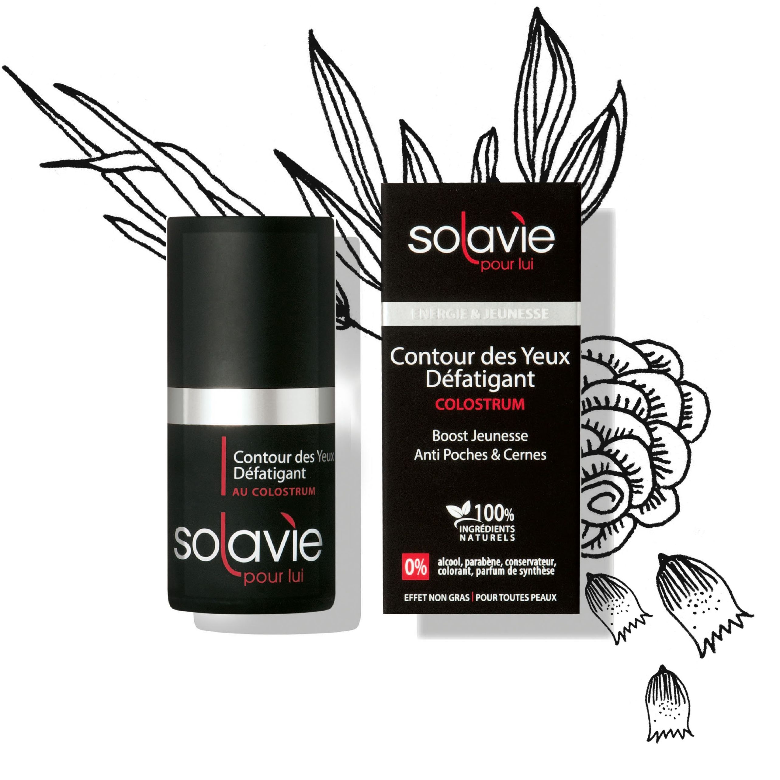 La Recherche SOLAVIE a développé une solution innovante pour prendre soin de votre contour de l’œil, atténuer les signes de l’âge et illuminer le regard. Sa combinaison d’actifs anti-âge et régénérants agit en synergie pour favoriser la micro-circulation de cette zone, réduire ainsi les cernes et décongestionner les poches. Concentré en stimulateurs de croissance, le soin Contour des Yeux pour Lui Énergie & Jeunesse booste la création de fibres de collagène et de molécules d’acide hyaluronique. Il crée comme un effet lift sur la paupière, tout en estompant les ridules et fameuses pattes d’oie.