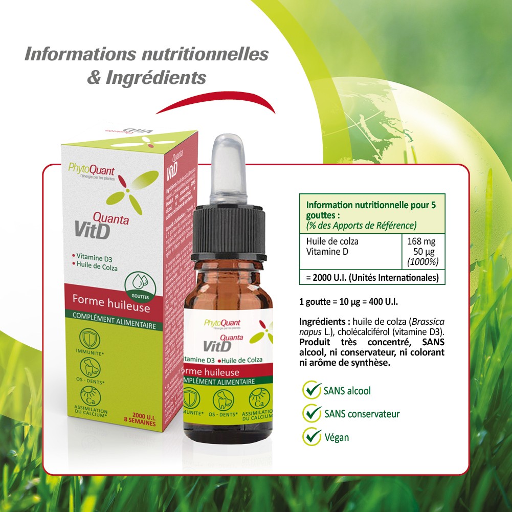 Elle associe de la vit. D3 végétale issue du Lichen d’Islande à de l’huile de colza (garantie non OGM).
